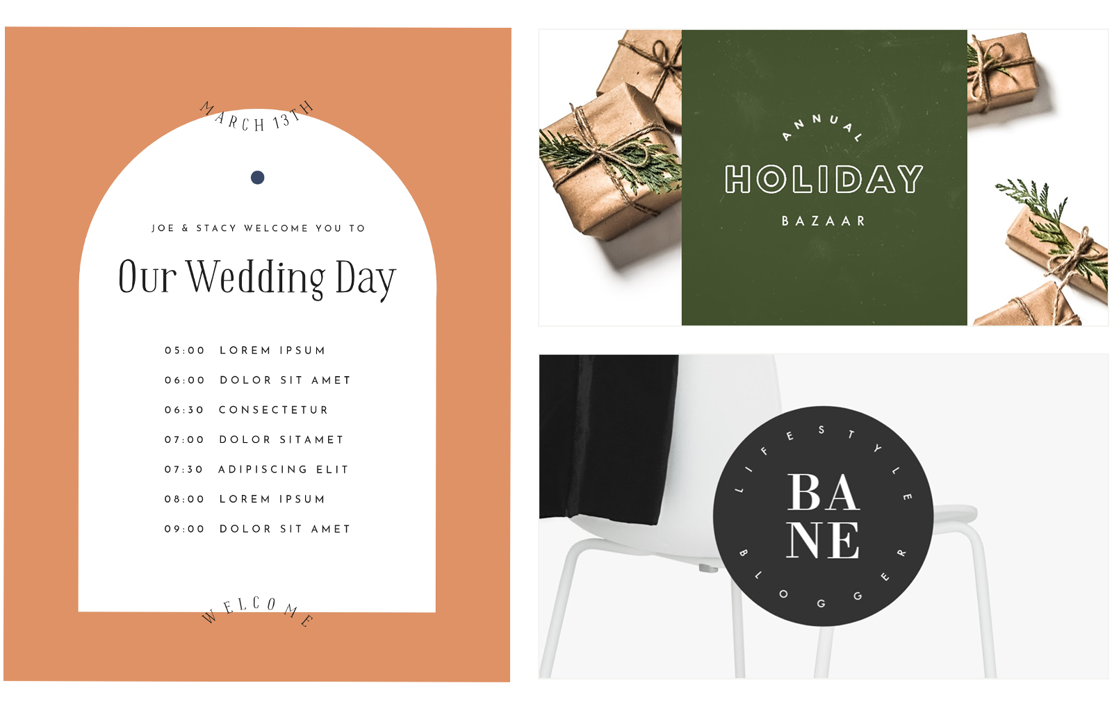 PicMonkey tiene una amplia gama de plantillas que utilizan nuestra herramienta de texto curvo para producir hermosas imágenes y gráficos. Echa un vistazo a estas muestras o explora toda nuestra colección para encontrar una plantilla que se adapte a tus necesidades.