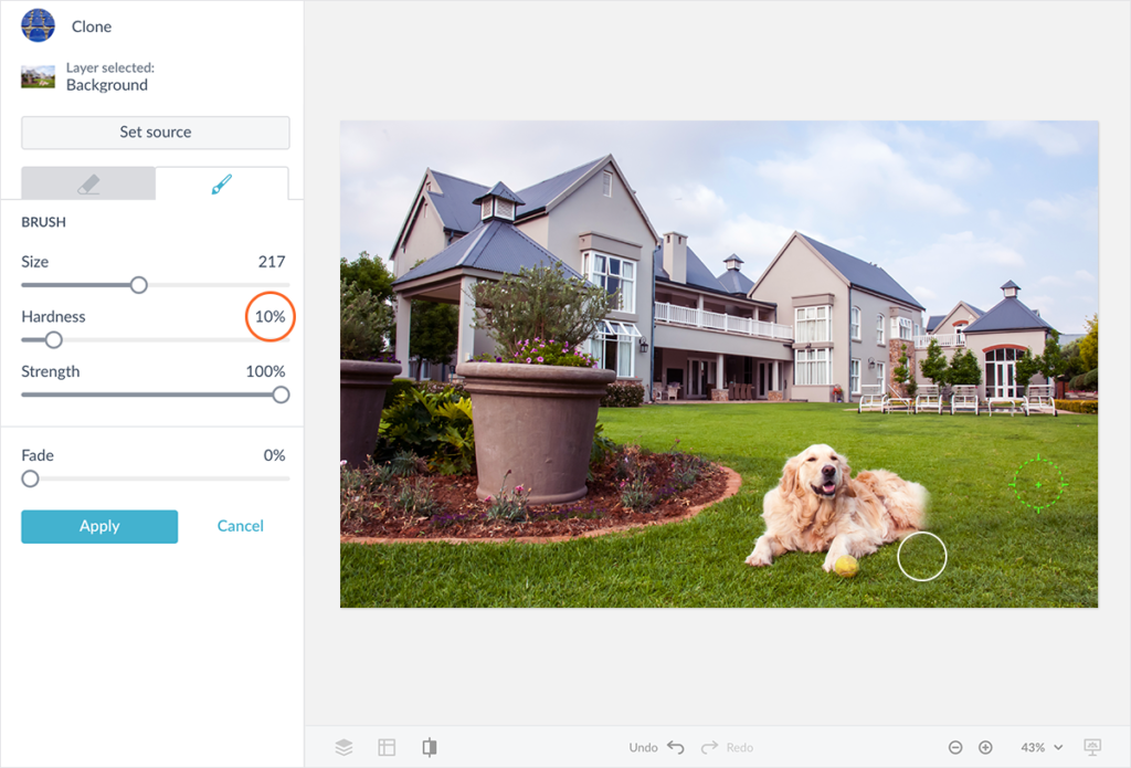 Si lo que busca es un toque suave al eliminar algo de una imagen, como la clonación de césped (como se muestra arriba), un cielo nublado o el cabello de alguien, puede ajustar el control deslizante de Dureza del pincel para que el área clonada quede más borrosa sin un borde definido.