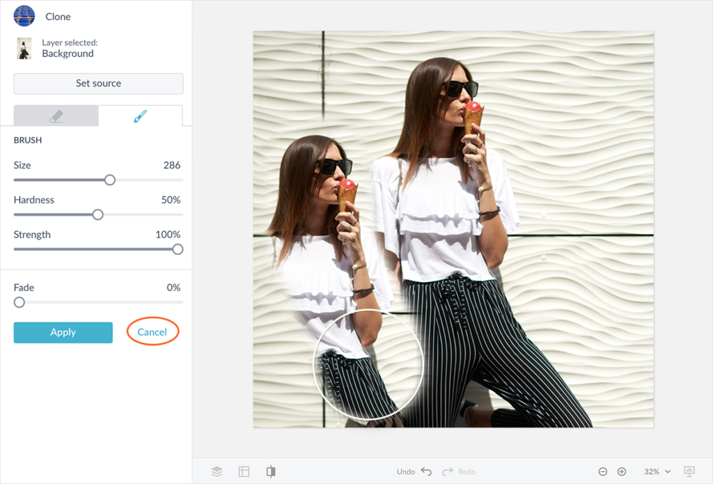 Si su proyecto es una obra de arte de varias capas, asegúrese de utilizar la herramienta de clonación en la capa correcta. Si accidentalmente comienza a clonar la capa incorrecta, no se preocupe, simplemente haga clic en Cancelar y el error no se aplicará.