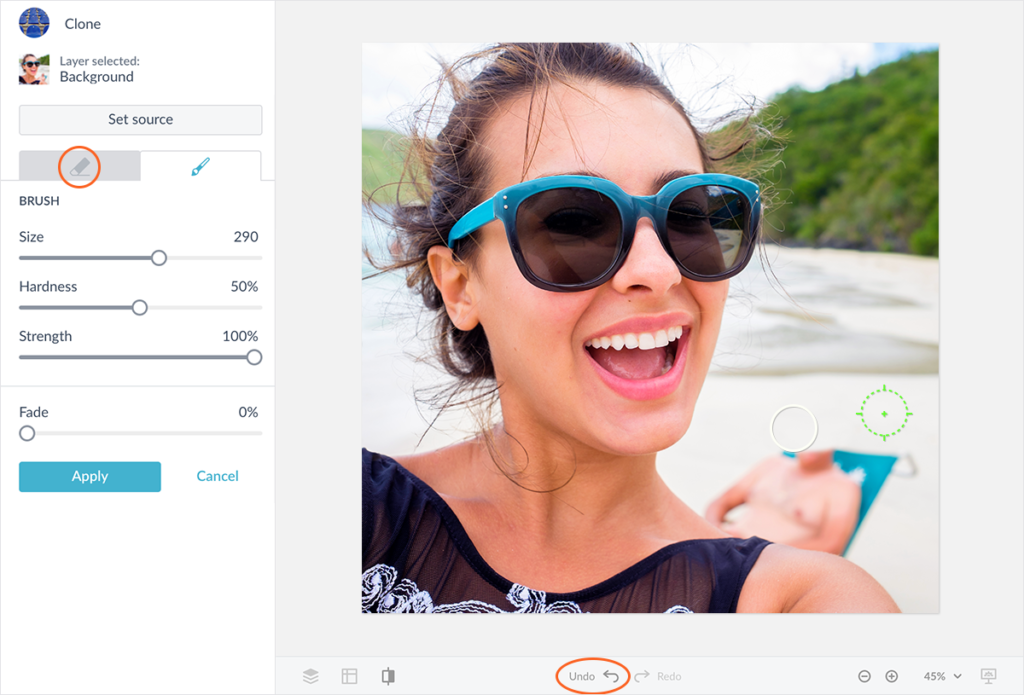 La herramienta de Clonación de PicMonkey le permite “borrar” partes de sus fotos cubriéndolas con detalles de otra área de la foto. Básicamente, está estampando arena limpia sobre el desconocido sentado en la arena, o estampando el cielo azul sobre su dedo en la esquina.